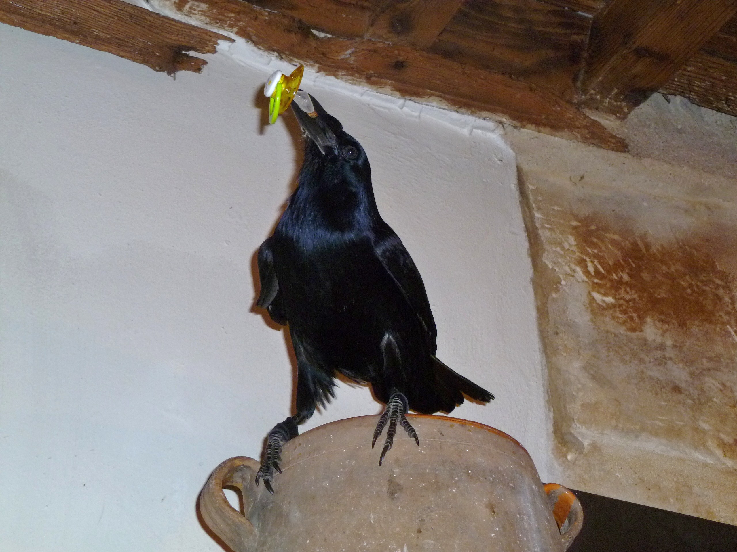 Mais le 29 juin dernier, nous avons accueilli M’Aïak. Avant de vous la montrer, je vous préviens : de tous les corbeaux que nous avons vu passer, celle-ci est la championne de la … laideur !! Jamais rien vu d’aussi mal fini !